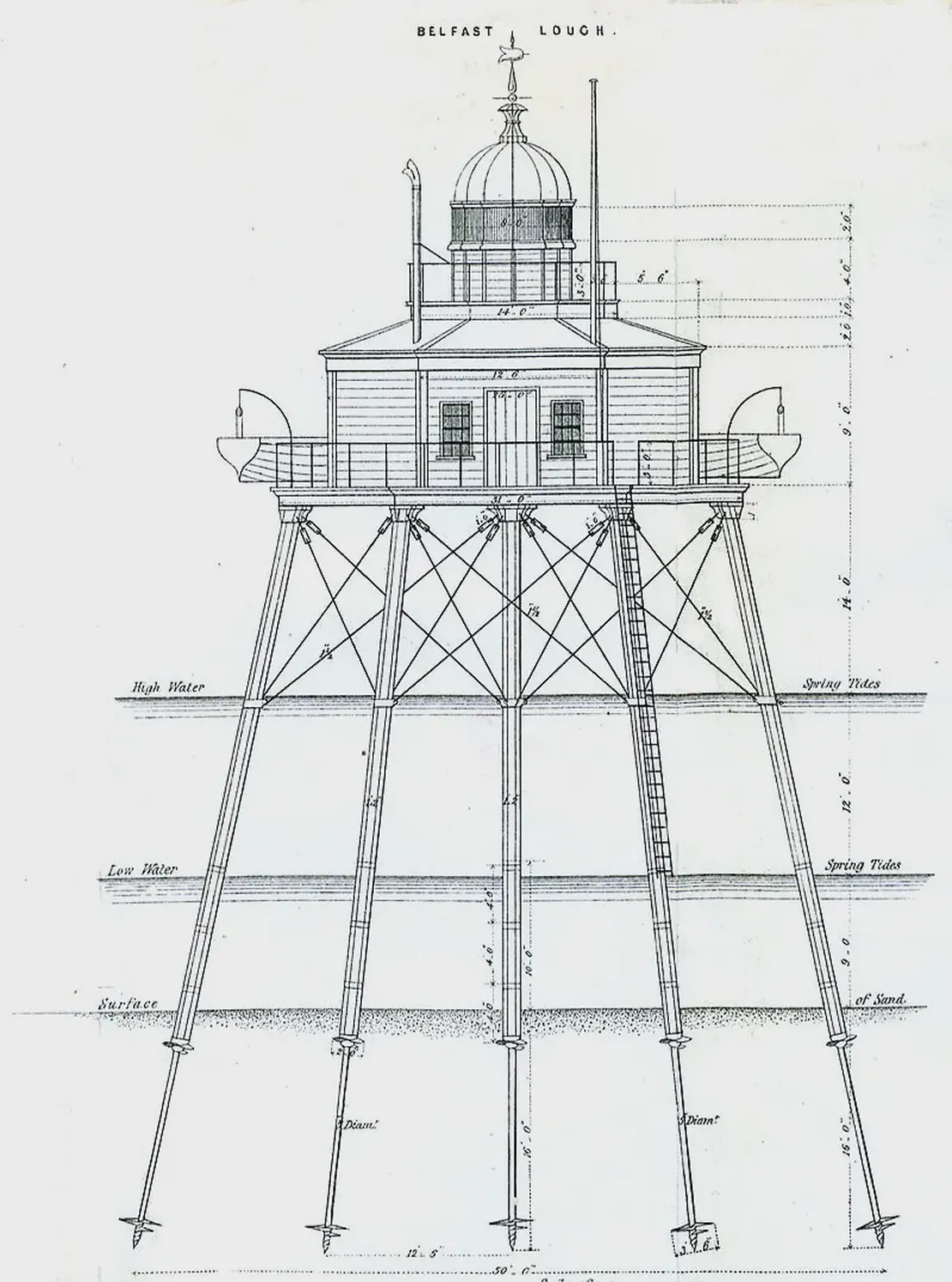 Originally working in brickmaking in Belfast, he invented machines used in that trade, before patenting the screw-pile in 1833, for which he would later gain some fame. The screw-pile was used for the erection of lighthouses and other structures on mudbanks and shifting sands, including bridges and piers. Mitchell’s designs and methods were employed all over the world from Portland breakwater to Bombay bridges. Initially it was used for the construction of lighthouses on Maplin Sands in the Thames Estuary (the first light application, in 1838), at Fleetwood Lancashire (UK) Morecambe Bay (the first Ever Beacon Lit ) completed, in 1839), and at Belfast Lough where his lighthouse was finished in July 1844.